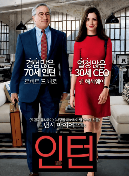 영화 인턴(Intern)은 2015년 개봉한 코미디 드라마 영화로서 낸시 마이어스 감독이 각본과 제작을 담당하였으며 70세의 베테랑 비즈니스맨 벤(로버트 드 니로)이 줄리 오스틴(앤 해서웨이)이 회사에 인턴으로 근무하게 되는 이야기입니다. 벤은 출판 회사의 임원으로 재직한 후 정년퇴직하고 아내와 사별하게 됩니다. 이후 벤은 패션 쇼핑몰 스타트업 기업의 CEO인 줄리 오스틴의 인턴으로 취직하게 됩니다. 벤은 연륜을 바탕으로 줄리 오스틴의 조언자 역할을 하면서 그녀와 함께 일하며 혁신적인 아이디어를 제공하는 등 협력합니다. 줄리 오스틴은 처음에는 벤의 보조 역할에 대해 달가워하지 않았습니다. 벤은 70세라는 나이와 무관하게 놀라운 친화력으로 직원들과 잘 지내며 서로에게 도움을 주는 모습을 보여줍니다. 줄리 오스틴은 벤의 이러한 지혜로운 모습과 상대를 편하게 해주는 매너들을 통해 신뢰를 쌓아가게 됩니다. 결국 벤과 줄리 오스틴은 서로 존중하고 격려하며 서로에게 멘토가 되어주며 협력하는 사이가 됩니다. 주인공인 벤은 70세의 할아버지로서 줄리 오스틴의 인턴으로 일하며 그녀와 함께 일하면서 여러 가지 문제를 해결하고 성장하게 됩니다. 벤은 출판 회사에서 임원으로 재직 후 정년퇴직하고 아내와도 3년 전에 사별하였습니다. 출판 회사에서 40년간 근무한 벤은 그동안의 직장 생활로 익숙해진 습관들이 있습니다. 벤은 그동안의 경험과 지혜로 줄리 오스틴에게 여러 방면에서 많은 도움을 주게 됩니다. 또한 줄리 오스틴은 패션 쇼핑몰 스타트업 기업의 CEO로서 회사를 성장시키기 위해 여러 가지 문제들을 해결하면서 자신의 역량을 발휘합니다. 줄리 오스틴은 사업을 시작하고 1년 내에 회사의 직원 수를 200명 이상으로 키워내며 회사의 성장에 이바지합니다. 줄리 오스틴은 일에 대해 남다른 열정을 가지고 있으며 단기간에 사업의 성장을 성공적으로 만들었으며 젊은 기혼 여성의 삶을 보여줍니다.